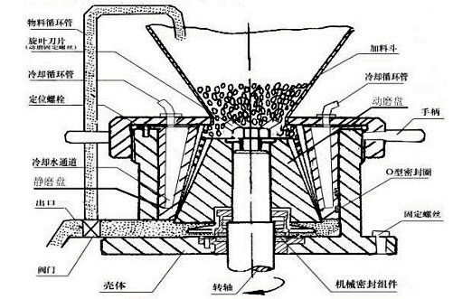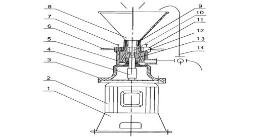 9.進料通道 10.旋葉刀 11.調節盤 12.靜磨盤 13.動磨盤 14.循環管