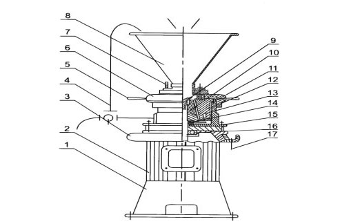 9.手柄10.壓蓋 11.活接 12.加料斗 13.旋葉刀 14.動磨盤 15.靜磨盤 16.調節盤