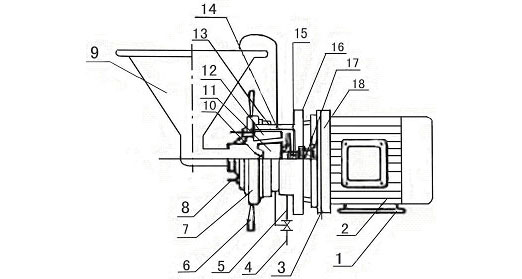 1.底座 2.電動機 3.殼體 4.主軸 5.機械密封組件 6.手柄 7.定位螺絲8.加料斗