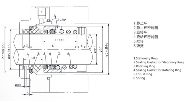 單端面、非平衡型、錐形彈簧傳動結構,彈簧另一端并圈鎖定在軸上,彈簧旋向與泵軸旋向有關。